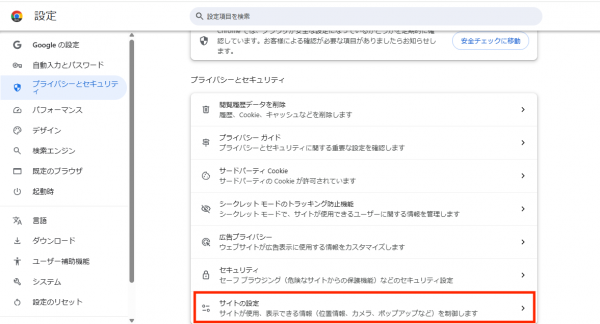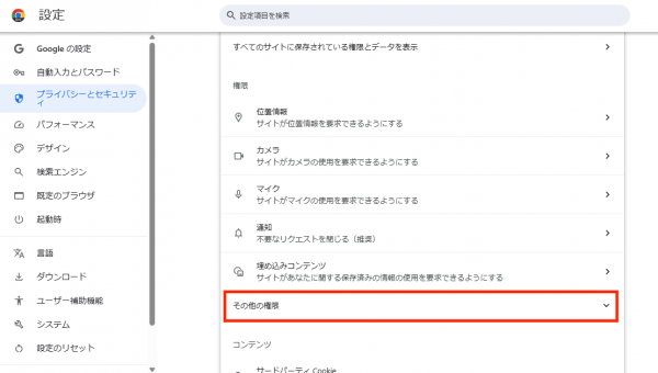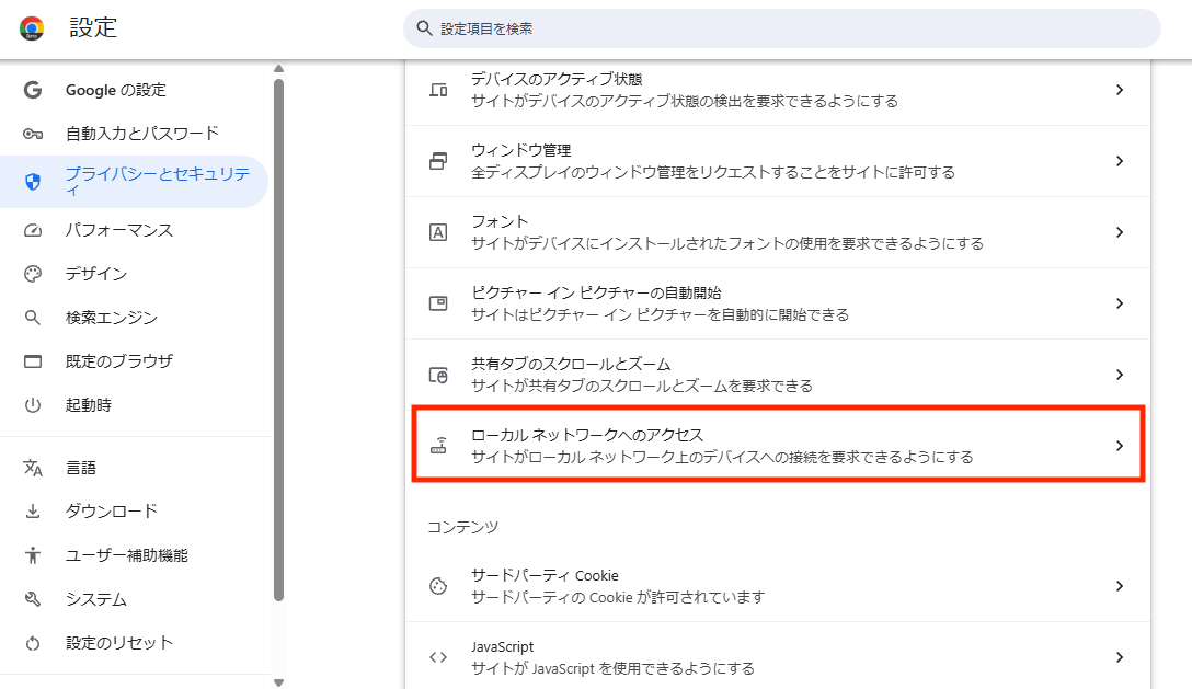 「プライバシーとセキュリティ」をクリックし、画面中央の「サイトの設定」をクリック、権限欄の「その他の権限」をクリックし展開、展開後、下部に「ローカルネットワークへのアクセス」が表示されるので、クリック。