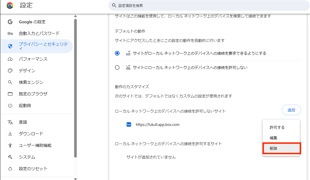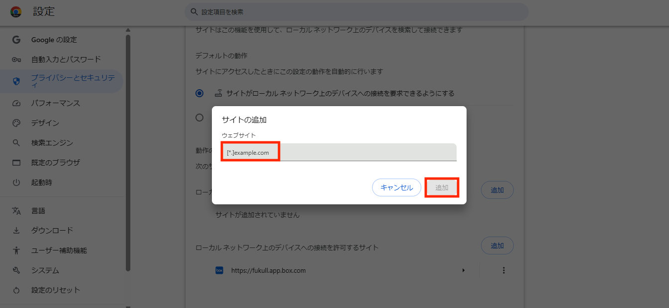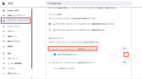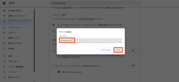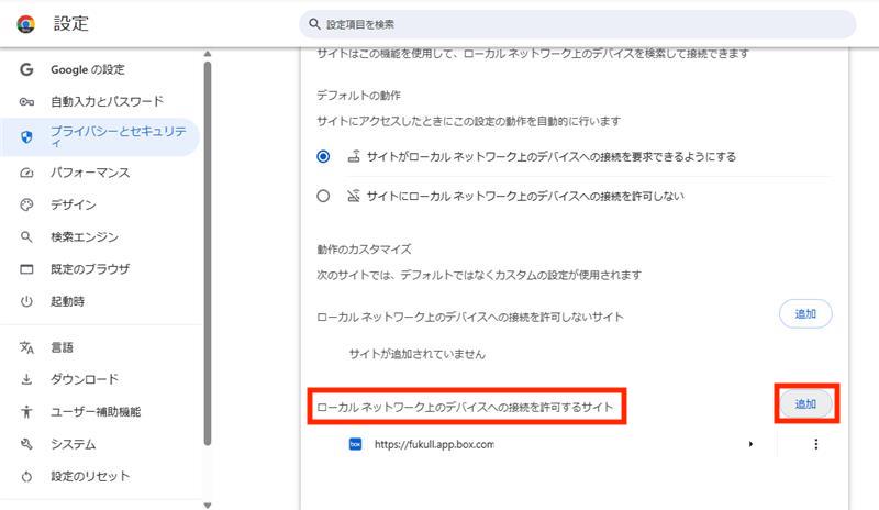 「ローカルネットワーク上のデバイスへの接続を許可するサイト」に下記の情報を追加することで、
