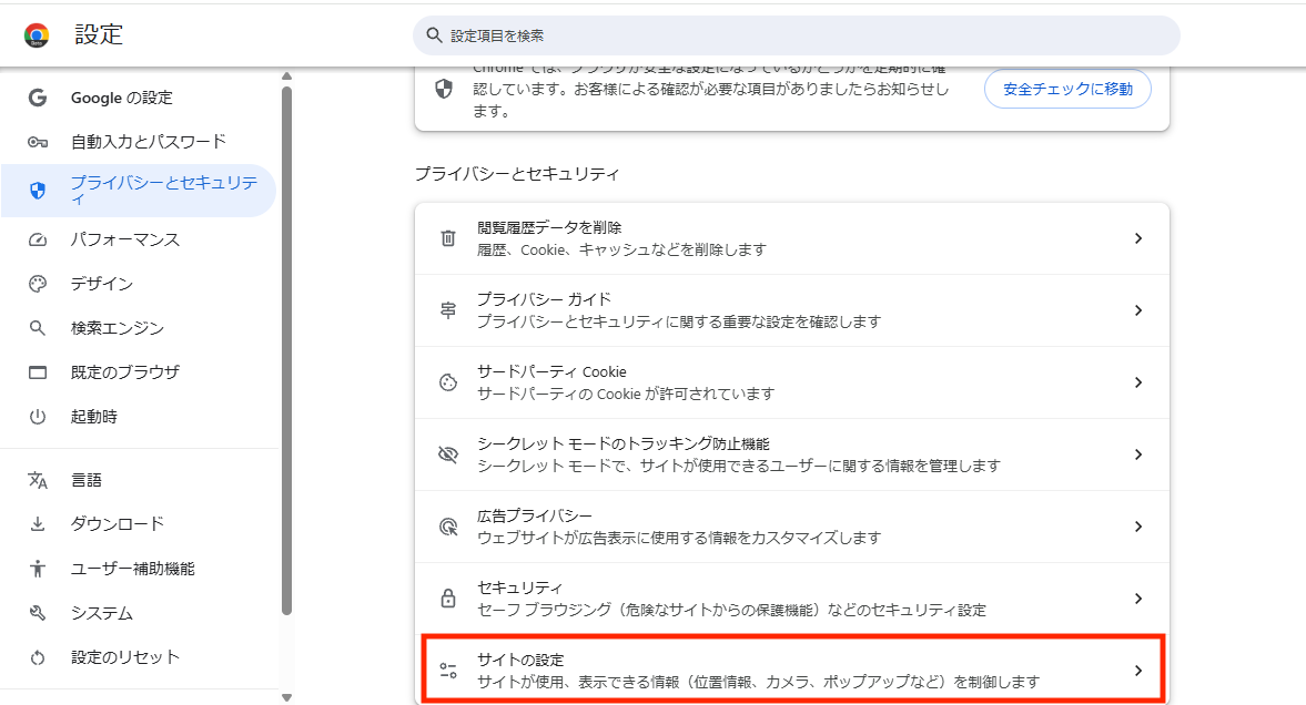 「ブロック」を行なってしまった場合には、Chromeの設定画面より設定変更をお願いします。