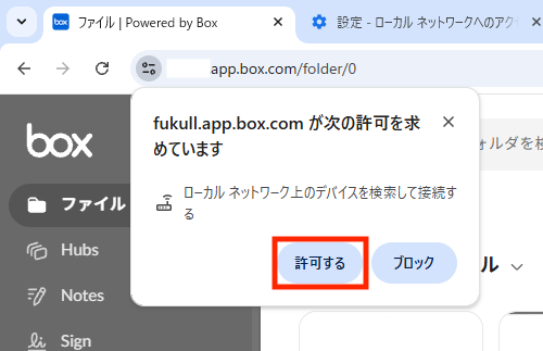 この確認を「ブロック」すると、Box Tools の機能が正しく動作せず、パソコンにBox Toolsがインストールされていたとしても、再度インストールを求められます。
