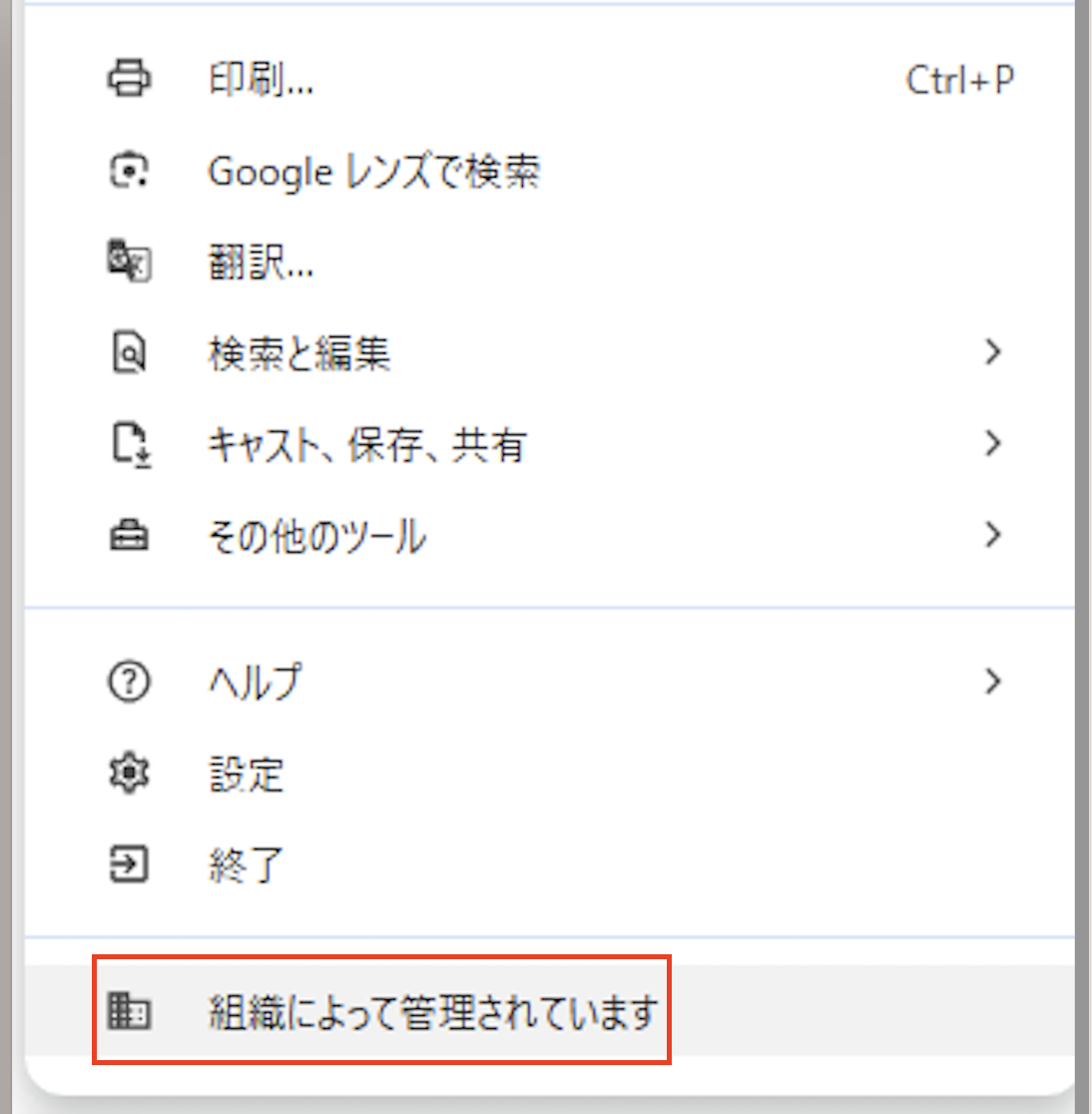 3. メニューの一番下に「組織によって管理されています」と表示されていれば、管理対象です。